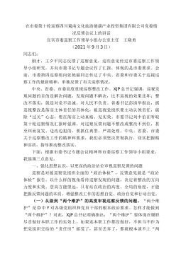 在市委第十轮巡察四川蜀南文化旅游健康产业投资集团有限公司党委情况反馈会议上的讲话宜宾市委巡察工作领导小组办公室主任王晓勇(2021年9月3日)同志们:刚才,王夕平同志反馈了巡察意见,这些意见经过市委巡察工作领导小组研究,并向市委书记专题会议作了汇报,体现的是市委要求。会前,市委第四巡察组向张艳丽同志传达了中央、省委和市委关于巡视巡察工作的最新精神,单独反馈了有关巡察情况。中央、省委、市委高度重视巡察整改工作。XJP总书记强调,巡视发现问题的目的是解决问题,发现问题不解决,比不巡视的效果还坏;整改不落实,就是对党不忠诚、对人民不负责。省委书记彭清华指出,抓巡视整改是落实主体责任的具体化,被巡视党...