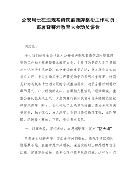 在正风肃纪警示教育会暨违规吃喝专项查纠行动推进会上的讲话同志们:今天,我们在这里召开全县公安机关正风肃纪警示教育会暨违规吃喝专项查纠行动推进会,主要任务是深入学习贯彻总书记关于全面从严治党、加强作风建设的重要论述和指示批示精神,全面落实省委、市委、县委以及省公安厅、市公安局党委关于正风肃纪的部署要求,集中通报剖析违纪违法典型案例,对违规吃喝专项查纠行动进行再动员、再部署、再推进。这既是一次严肃的警示教育、问题剖析会,更是一次深刻的思想洗礼、纪律整训会。目的就是要通过以案示警、以案明纪、以案促改,教育引导全警深刻认识违规吃喝等作风问题的政治本质和严重危害,进一步拧紧思想“总开关”,绷紧纪律“高压线”,压实责任“传导链”,以自我革命的决心和勇气,坚决纠治“四风”特别是违规吃喝顽瘴痼疾,持续净化公...