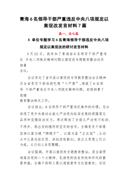 青海6名领导干部严重违反中央八项规定以案促改发言材料7篇篇一,共七篇X单位专题学习6名青海领导干部违反中央八项规定以案促改的研讨发言材料5月22日,我参加了青海省6名领导干部严重违反中央八项规定精神问题以案促改专题教育整治动员部署会议。会议传达了省州县以案促改专项教育整治会议精神及全省党员干部违规吃喝“十严禁”,通报了6名领导干部严重违反中央八项规定精神问题,安排部署了我镇教育整治相关工作。会议指出,6名领导干部严重违纪案件的处理,充分体现了党中央推动全面从严治党向纵深发展的顽强意志品质和坚强政治定力,再次释放了全面从严治党不松劲、不停步、再出发的强烈而坚定的信号。全镇党员干部要坚持以案为镜“...