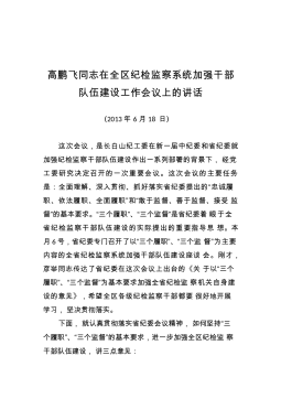 高鹏飞同志在全区纪检监察系统加强干部队伍建设工作会议上的讲话(2013年6月18日)这次会议,是长白山纪工委在新一届中纪委和省纪委就加强纪检监察干部队伍建设作出一系列部署的背景下,经党工委研究决定召开的一次重要会议。这次会议的主要任务是:全面理解、深入贯彻、抓好落实省纪委提出的“忠诚履职、依法履职、全面履职”和“敢于监督、善于监督、接受监督”的基本要求。“三个履职”、“三个监督”是省纪委着眼于全省纪检监察干部队伍建设的实际提出的重要指导思想。本月6号,省纪委专门召开了以“三个履职”、“三个监督”为主要内容的全省纪检监察系统加强干部队伍建设座谈会。刚才,彦举同志传达了省纪委在这次会议上出台的《关...