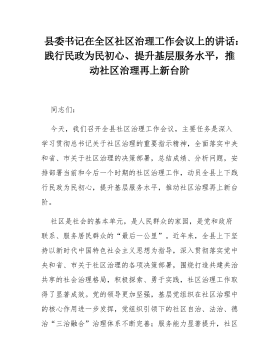 县委书记在全区社区治理工作会议上的讲话:践行民政为民初心、提升基层服务水平,推动社区治理再上新台阶同志们:今天,我们召开全县社区治理工作会议,主要任务是深入学习贯彻总书记关于社区治理的重要指示精神,全面落实中央和省、市关于社区治理的决策部署,总结成绩、分析问题,安排部署当前和今后一个时期的社区治理工作,动员全县上下践行民政为民初心,提升基层服务水平,推动社区治理再上新台阶。社区是社会的基本单元,是人民群众的家园,是党和政府联系、服务居民群众的“最后一公里”。近年来,全县上下坚持以新时代中国特色社会主义思想为指导,深入贯彻落实党中央和省、市关于社区治理的各项决策部署,围绕打造共建共治共享的社会治理格局,积极探索、勇于实践,社区治理工作取得了显著成效。党的领导更加坚强,基层党组织在社区治理中的核...