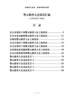 仅限学习交流,请勿抄袭和出售—1—警示教育大会讲话汇编(文章来源于网络)目录在全市领导干部警示教育大会上的讲话............................2在全市党风廉政警示教育大会上的讲话.........................21在集团警示教育大会上的讲话..........................................31在全区领导干部警示教育大会上的讲话.........................43在全县领导干部警示教育大会上的讲话.........................50在州政协党风廉政警示教育大会上的讲话............