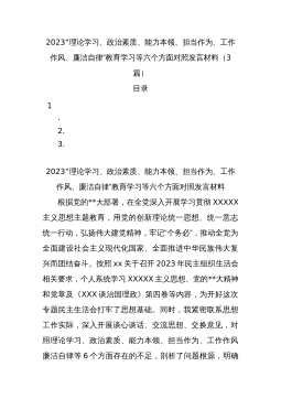 2023“理论学习、政治素质、能力本领、担当作为、工作作风、廉洁自律”教育学习等六个方面对照发言材料(3篇)目录1.2.3.2023“理论学习、政治素质、能力本领、担当作为、工作作风、廉洁自律”教育学习等六个方面对照发言材料根据党的**大部署,在全党深入开展学习贯彻XXXXX主义思想主题教育,用党的创新理论统一思想、统一意志统一行动,弘扬伟大建党精神,牢记“个务必”,推动全党为全面建设社会主义现代化国家、全面推进中华民族伟大复兴而团结奋斗。按照xx关于召开2023年民主组织生活会相关要求,个人系统学习XXXXX主义思想、党的**大精神和党章及《XXX谈治国理政》第四卷等内容,为开好这次专题民主...