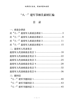 仅限学习交流,请勿抄袭和出售—1—“八一”建军节相关素材汇编目录一、座谈会讲话庆“八一”退役军人座谈会讲话1....................................3庆“八一”退役军人座谈会讲话2....................................8庆“八一”退役军人座谈会讲话3.................................11庆“八一”退役军人座谈会讲话4.................................15二、退役军人代表发言退役军人代表座谈会发言1......................................