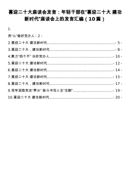 喜迎二十大座谈会发言:年轻干部在“喜迎二十大建功新时代”座谈会上的发言汇编(10篇)1.用“心”做好党办人-2-2.喜迎二十大建功新时代.............................................................-5-3.喜迎二十大,建功新时代..........................................................-8-4.聚力“四个不”当好党办人.........................................................-10-5.喜迎二十大建功新时代..........