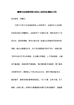 董事长在经营形势分析会上的讲话(集团公司)各位领导、同事们:大家下午好!今天在座的既有xx领导班子、总部各中心总经理,还有各区域公司董事长、总经理,听了大家的汇报,期间也进行了交流讨论,我深有感触,想与大家分享一些做企业和做项目的想法和思路。做企业就像在打仗,孙子兵法提到胜可知不可为,知胜五道:“知可以战与不可以战者胜,识众寡之用者胜,上下同欲者胜,以虞待不虞者胜,将能而君不御者胜。”我们要判断市场趋势,要了解自己和竞争对手,要营造上下同心的企业文化,要尽可能准备充分、做好细节,要有优秀的管理者和团队。“天下大事,必作于细。天下难事,必做于易”。所有的大事都要抓关键节点和关键细节,逐级跟进,保...