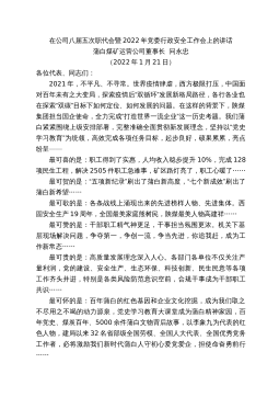 在公司八届五次职代会暨2022年党委行政安全工作会上的讲话蒲白煤矿运营公司董事长问永忠(2022年1月21日)各位代表、同志们:2021年,不平凡、不寻常。世界疫情肆虐,西方极限打压,中国面对百年未有之大变局,探索疫情后“双循环”发展新格局路径,各行各业也在探索“双碳”目标下如何定位、如何发展的问题。在这样的背景下,陕煤集团担当国企使命,全力完成“打造世界一流企业”这一历史考题。我们蒲白紧紧围绕上级安排部署,完整准确全面贯彻新发展理念,坚持以“党史学习教育”为统领,高效完成各项任务目标,起步良好,硕果累累,亮点纷呈——最可喜的是:职工得到了实惠,人均收入稳步提升10%,完成128项民生工程,解...