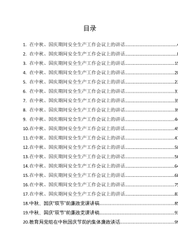 目录1.在中秋、国庆期间安全生产工作会议上的讲话...........................................42.在中秋、国庆期间安全生产工作会议上的讲话...........................................83.在中秋、国庆期间安全生产工作会议上的讲话.........................................154.在中秋、国庆期间安全生产工作会议上的讲话.........................................205.在中秋、国庆期间安全生产工作会议上的讲话.................