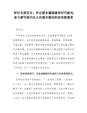 研讨交流发言:牢记根本遵循涵育时代新风,奋力谱写现代化人民城市建设的宣传新篇章同志们:中央城市工作会议的胜利召开,在我国城市发展史上具有里程碑意义。总书记发表的重要讲话,高屋建瓴、思想深邃、内涵丰富,系统阐述了新时代新征程做好城市工作的重大理论和实践问题,为我们全面推进城市现代化建设指明了前进方向、提供了根本遵循。作为党的宣传思想文化战线的一员,深入学习领会、坚决贯彻落实会议精神,特别是总书记重要讲话精神,是我们的重大政治责任和首要任务。下面,结合宣传思想文化工作实际,谈三个方面的认识和体会。一、深学细悟笃行,切实凝聚新时代城市工作的思想伟力总书记在讲话中深刻指出:“人民城市人民建、人民城市为人民”。这一根本立场贯穿会议始终,鲜明回答了“城市发展为了谁、依靠谁”的根本性、方向性问题。以此为根...