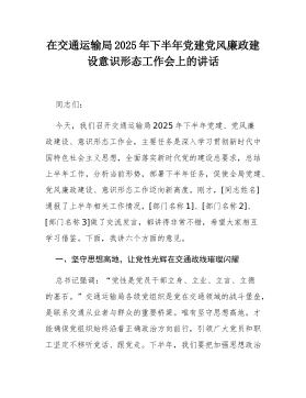 在交通运输局2025年下半年党建党风廉政建设意识形态工作会上的讲话同志们:今天,我们召开交通运输局2025年下半年党建、党风廉政建设、意识形态工作会,主要任务是深入学习贯彻新时代中国特色社会主义思想,全面落实新时代党的建设总要求,总结上半年工作,分析当前形势,部署下半年任务,促使全局党建、党风廉政建设、意识形态工作迈向新高度。刚才,[同志姓名]通报了上半年相关工作情况,[部门名称1]、[部门名称2]、[部门名称3]做了交流发言,都讲得非常不错,希望大家相互学习借鉴。下面,我讲六个方面的意见。一、坚守思想高地,让党性光辉在交通战线璀璨闪耀总书记强调:“党性是党员干部立身、立业、立言、立德的基石。”交通运输局各级党组织是党在交通领域的战斗堡垒,是联系交通从业者与群众的重要桥梁。唯有坚守思想高地,...