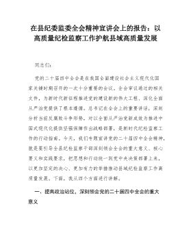 在县纪委监委全会精神宣讲会上的报告:以高质量纪检监察工作护航县域高质量发展同志们:党的二十届四中全会是在我国全面建设社会主义现代化国家关键时期召开的一次十分重要的会议。全会审议通过的相关文件,为新时代新征程推进党的建设新的伟大工程、深化全面从严治党提供了根本遵循。总书记在全会上的重要讲话,深刻分析当前反腐败斗争形势,对以全面从严治党新成效为推进中国式现代化提供坚强保障作出战略部署,是新时代纪检监察工作的行动指南。今天,我们专题宣讲党的二十届四中全会精神,就是要引导全县纪检监察干部深刻领会全会的重大意义、核心要义和实践要求,把思想和行动统一到党中央决策部署上来,以更加坚定的决心、更加有力的举措推动县域纪检监察工作高质量发展。下面,我从四个方面进行讲解。一、提高政治站位,深刻领会党的二十届四中全...