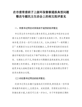 在市委常委班子上级环保督察通报典型问题整改专题民主生活会上的相互批评意见一、市委书记同志对其他班子成员的批评意见市长同志作为市政府主要负责同志,在统筹全市经济社会发展与生态环境保护方面做了大量卓有成效的工作。但从更高标准来看,还存在一些可以改进之处。比如,在推动“一核两翼三区”发展路径与生态环保深度融合上,思考和谋划的系统性还可以再加强。有时为了推动重大项目尽快落地,存在着对项目潜在环境风险评估把关不够严的倾向,对一些整改任务的复杂性、长期性认识不足,导致部分问题整改虽然速度快,但长效机制的建立有所滞后。希望市长同志今后在统筹发展与保护时,能更多地从战略层面进行考量,真正把绿色发展的理念贯穿于政府决策的全过程。(二)对纪委书记同志的批评意见:纪委书记同志在履行监督执纪问责职责,特别是在一些环...
