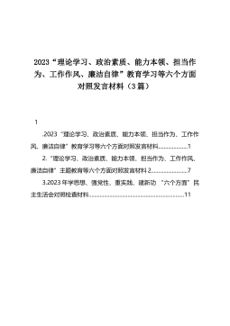 主题教育六个方面对照发言材料汇编:2023年“理论学习、政治素质、能力本领、担当作为、工作作风、廉洁自律”教育学习等六个方面对照发言材料(3篇)