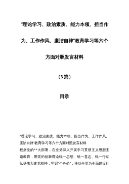 2023“理论学习、政治素质、能力本领、担当作为、工作作风、廉洁自律”教育学习等六个方面对照发言材料(3篇)1.2023“理论学习、政治素质、能力本领、担当作为、工作作风、廉洁自律”教育学习等六个方面对照发言材料.....................12.“理论学习、政治素质、能力本领、担当作为、工作作风、廉洁自律”主题教育等六个方面对照发言材料2..........................73.2023年学思想、强党性、重实践、建新功“六个方面”民主生活会对照检查材料............................................................
