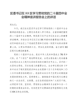 区委书记在XX区学习贯彻党的二十届四中全会精神宣讲报告会上的讲话同志们:今天,我们在这里召开全区学习贯彻党的二十届四中全会精神宣讲报告会,主要任务是深入学习领会、全面准确把握党的二十届四中全会精神,特别是习近平总书记在全会上的重要讲话精神,并结合总书记近日在XX考察时的重要指示要求,动员和组织全区上下迅速把思想和行动统一到党中央的决策部署上来,以更加昂扬的斗志、更加扎实的举措,奋力谱写XX区现代化建设新篇章。党的二十届四中全会,是在中华人民共和国成立76周年之际,在“十四五”规划即将完成、全党全国各族人民向着基本实现社会主义现代化目标迈进的关键历史节点上,召开的一次具有全局性、历史性意义的重要会议。全会审议通过的《中共中央关于制定国民经济和社会发展第十五个五年规划和二〇三五年远景目标的建议》...