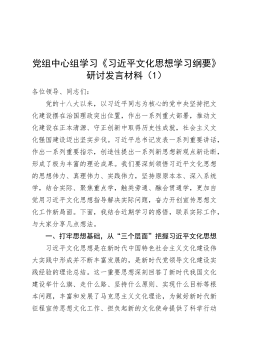 党组中心组学习《习近平文化思想学习纲要》研讨发言材料(1)各位领导、同志们:党的十八大以来,以习近平同志为核心的党中央坚持把文化建设摆在治国理政突出位置,作出一系列重大部署,推动文化建设在正本清源、守正创新中取得历史性成就,社会主义文化强国建设迈出坚实步伐。习近平总书记发表一系列重要讲话,作出一系列重要指示,创造性提出一系列新思想新观点新论断,形成了极为丰富的理论成果。我们要深刻领悟习近平文化思想的思想伟力、真理伟力、实践伟力,坚持原原本本、深入系统学,结合实际、聚焦重点学,触类旁通、融会贯通学,更加自觉用习近平文化思想指导解决实际问题,奋力开创宣传思想文化工作新局面。下面,我结合近期学习的感...