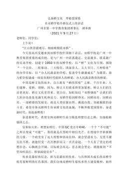 弘扬桥文化厚植爱国情在双桥学校升旗仪式上的讲话广州市第一中学教育集团理事长胡革新(2021年9月27日)老师们、同学们:上午好!“江山胜景描难尽,细雨晴烟看双桥”。今天很高兴受邀来到双桥学校作国旗下讲话,双桥学校是广州一中教育集团重要的成员校,是与广州一中距离最近、交流最多、联系最广的兄弟学校。创建于1950年的双桥学校,以“桥”文化为引领,围绕“一个宗旨、二轮驱动、三大特色、四面育人、五大节日、六种特质”的办学目标,以“办人民满意的学校,促进学生健康成长”为愿景,致力把学校建成一座培育新时代接班人的桥梁,办人民满意教育的桥梁。中国是桥文化的故乡,自古就有“桥的国度”之称。千百年来,人们建桥、...