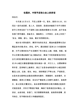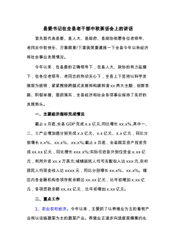 县委书记在全县老干部中秋茶话会上的讲话首先我代表县委、县人大、县政府、县政协祝愿各位老领导、老同志中秋快乐、万事顺意!下面我简要通报一下全县今年以来经济和社会事业发展情况。今年以来,在县委的正确领导下,在县人大、政协的有力监督下,在各位老领导、老同志的热切关心下,全县上下坚持以科学发展观为统领,紧紧围绕跨越式发展和构建和谐xx两大主题,创新思路、积极举措、狠抓落实,全县经济和社会各项事业保持了良好的发展势头。一、主要经济指标完成情况截止x月底,全县GDP完成x.x亿元,同比增长xx.x%,其中一、二、三产业增加值分别完成x.x亿元、x.x亿元、x.x亿元,同比分别增长x.x%、xx.x%、xx...