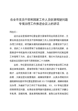在全市党员干部和国家工作人员饮酒驾驶问题专项治理工作推进会议上的讲话同志们:这次会议是报请市纪委监委主要领导同志同意召开的,主要任务是总结全市党员干部和国家工作人员饮酒驾驶问题线索办理工作情况,研究解决遇到的困难和问题,部署安排下步工作。党的二十大系统擘画了全面建设社会主义现代化国家、全面推进中华民族伟大复兴的宏伟蓝图,为做好新时代纪检监察工作指明了方向,提出了新的更高要求。我们今天的这次会议,也是在以实际行动学习贯彻党的二十大精神。会前,市纪委党风室汇总形成了全市酒驾专项治理工作进展总体情况报告,委领导听取了相关汇报并进行了专题研究。刚才,会同党风室又逐一听了各县市区纪委监委专题汇报。总的看...