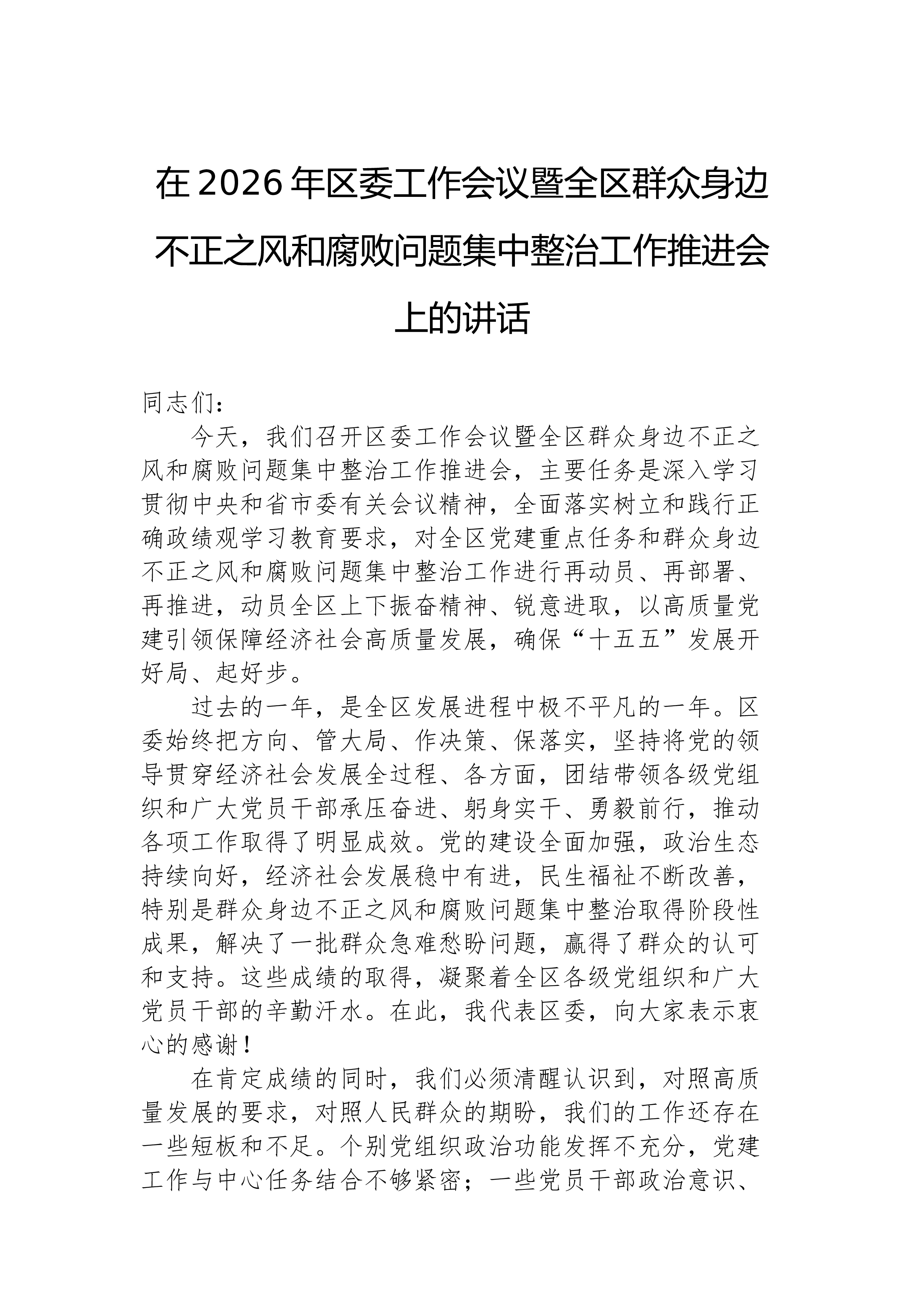 在2026年区委工作会议暨全区群众身边不正之风和腐败问题集中整治工作推进会上的讲话同志们:今天,我们召开区委工作会议暨全区群众身边不正之风和腐败问题集中整治工作推进会,主要任务是深入学习贯彻中央和省市委有关会议精神,全面落实树立和践行正确政绩观学习教育要求,对全区党建重点任务和群众身边不正之风和腐败问题集中整治工作进行再动员、再部署、再推进,动员全区上下振奋精神、锐意进取,以高质量党建引领保障经济社会高质量发展,确保“十五五”发展开好局、起好步。过去的一年,是全区发展进程中极不平凡的一年。区委始终把方向、管大局、作决策、保落实,坚持将党的领导贯穿经济社会发展全过程、各方面,团结带领各级党组织和广大党员干部承压奋进、躬身实干、勇毅前行,推动各项工作取得了明显成效。党的建设全面加强,政治生态持续...