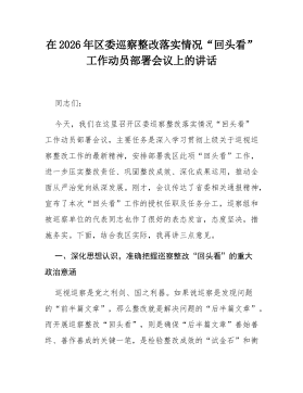 在2026年区委巡察整改落实情况“回头看”工作动员部署会议上的讲话同志们:今天,我们在这里召开区委巡察整改落实情况“回头看”工作动员部署会议,主要任务是深入学习贯彻上级关于巡视巡察整改工作的最新精神,安排部署我区此项“回头看”工作,进一步压实整改责任、巩固整改成效、深化成果运用,推动全面从严治党向纵深发展。刚才,会议传达了省委相关通报精神,宣布了本次“回头看”工作的授权任职及任务分工,巡察组和被巡察单位的代表同志也作开好的表态发言,态度坚决,措施务实。下面,结合我区实际,我再讲三点意见。一、深化思想认识,准确把握巡察整改“回头看”的重大政治意涵巡视巡察是党之利剑、国之利器。如果说巡察是发现问题的“前半篇文章”,那么整改就是解决问题的“后半篇文章”。而开展巡察整改“回头看”,则是确保“后半篇文...