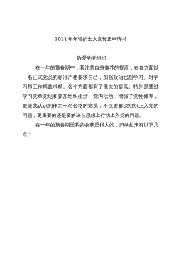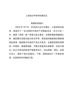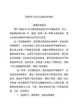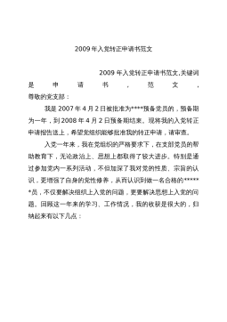 2009年入党转正申请书范文2009年入党转正申请书范文,关键词是申请书,范文,尊敬的党支部:我是2007年4月2日被批准为****预备党员的,预备期为一年,到2008年4月2日预备期结束。现将我的入党转正申请报告送上,希望党组织能够批准我的转正申请,请审查。入党一年来,我在党组织的严格要求下,在支部党员的帮助教育下,无论政治上、思想上都取得了较大进步。特别是通过参加党内一系列活动,不但加深了我对党的性质、宗旨的认识,更增强了自身的党性修养,从而认识到做一名合格的******员,不仅要解决组织上入党的问题,更要解决思想上入党的问题。回顾这一年来的学习、工作情况,我的收获是很大的,归纳起来有以下...