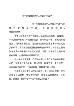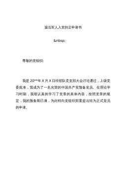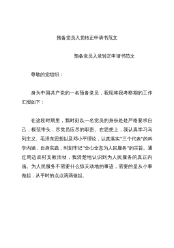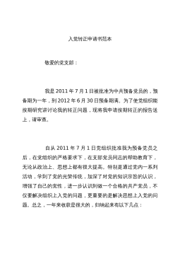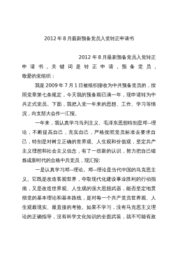 2012年8月最新预备党员入党转正申请书2012年8月最新预备党员入党转正申请书,关键词是转正申请,预备党员,敬爱的党组织:我是2009年7月1日被组织接收为中共预备党员的,按照党章第七条规定,今天我的预备期已满一年,现申请转为中共正式党员。下面,我把入党一年来的思想、工作、学习等情况,向支部大会作一汇报。一年来,我认真学习马列主义、毛泽东思想特别是邓--理论,不断提高自己,充实自己,严格按照党员标准去要求自己,特别是对树立正确的世界观、人生观和价值观,坚定共产主义理想和社会主义信念,有了一些新的认识,努力把自己锻炼成新时代的合格中共党员,现汇报:一是认真学习邓--理论。邓--理论是当代中国的...