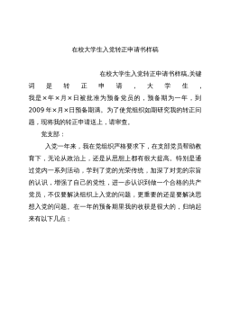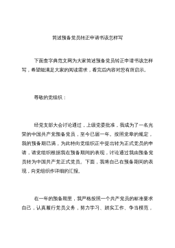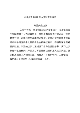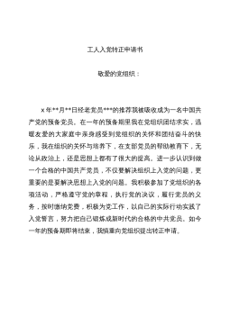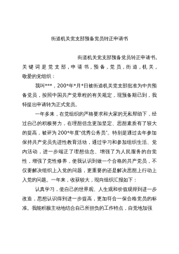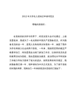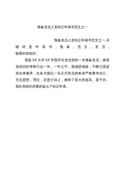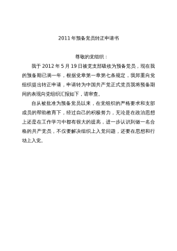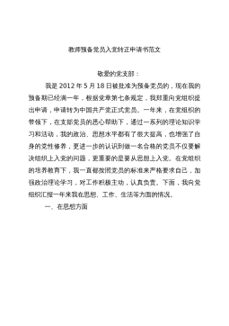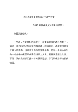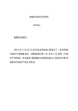 预备党员转正申请书敬爱的党组织:2013年1月22日,经过党支部批准,我成为了一名光荣的中国共产党预备党员。现预备期已满一年,今年1月,按照《中国共产党章程》有关规定,我郑重向支部组织提出入党转正申请,申请成为中国共产党正式党员。作为预备党员以来,我在党组织的严格要求下,在支部党员的帮助下,通过一系列的理论知识学习和活动,无论是从政治上还是思想上都有了很大的提高,也增强了自身的党性修养,更进一步的认识到做一个合格的共产党员,不仅要解决组织上入党的问题,更重要的是要从思想上入党。在党组织的培养教育下,我一直都按照党员的标准来严格要求自己,加强政治理论学习,对工作积极主动,认真负责。在这一年的预备...