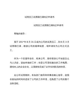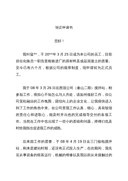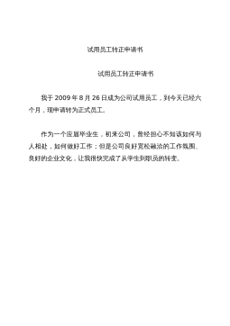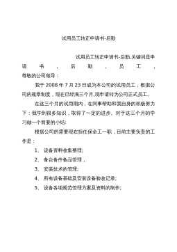 试用员工转正申请书-后勤试用员工转正申请书-后勤,关键词是申请书,后勤,员工,尊敬的公司领导:我于2008年7月23日成为本公司的试用员工,根据公司的规章制度,现在已经满三个月,现申请转为公司正式员工。在这三个月的试用期内,在同事帮助和我自身的积极努力下:我学到很多知识,取得了一定的进步。对于这三个月的学习做一个简要的小结:根据公司的需要现在担任保全工一职,目前主要负责的工作是:1、设备资料收集整理;2、备台备件备品管理,3、安装技术的管理;4、所有设备基础及安装设备验收记录;5、设备各项规范管理方案及资料的制作;进入公司这一段时间主要是:设备资料的收集整理、设备各项规范管理方案及资料的制作,...