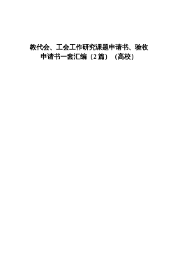 教代会、工会工作研究课题申请书、验收申请书一套汇编(2篇)(高校)教代会、工会工作研究课题申请书(模板)课题名称:项目负责人:所在部门工会:申请日期:xx大学工会委员会制年月日一、申请人简要情况项目概况项目名称申请类别A.重点B.一般C.专题预期成果起止年限年月———年月申请人姓名性别出生年月研究专长学历学位专业技术职务联系电话传真电子信箱所在单位名称合作单位合作单位项目姓名职称工作单位研究专长签名组成申请人近三年来主要研究成果及承担课题情况二、课题论证(一)本课题国内外研究现状及趋势,研究本课题的实际意义和理论意义(二)本课题的基本内容,课题的研究思路和方法、研究工作方案(包括已进行的研究工...