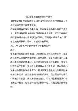 在编老师辞职申请书2022前言:在编老师辞职申请书2022为网的会员投稿推荐,但愿对你的学习工作带来帮助。工作中,或许是自己能力不足,导致工作没有办法进展,或者工作多年,已经开始步入厌倦了,这时候就需要放下职位,辞职来让自己放松一下了。关于教师辞职申请书怎么写?想了解更多相关的辞职申请书可以点击“辞职申请书”查看详情喔。在编老师辞职申请书2022范文1尊敬的王校长:你好!我是---,今天我郑重的向您提出辞职申请,希望您能批准并谅解!回顾我到杨氏的一年多的时间,心中感慨万端,感觉有话要说。首先,我要感谢您!感谢您代表杨氏对我的接纳。想当初我来到杨氏,是一个思想很简单的人。也没有太高的学历,没有太...