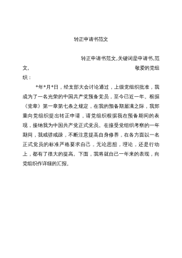 转正申请书范文转正申请书范文,关键词是申请书,范文,敬爱的党组织:*年*月*日,经支部大会讨论通过,上级党组织批准,我成为了一名光荣的中国共产党预备党员,至今已近一年。根据《党章》第一章第七条之规定,在我的预备期届满之际,我郑重向党组织提出转正申请,请党组织根据我在预备期间的表现,接纳我为中国共产党正式党员。在接受党组织考察的一年期间,我戒骄戒躁,不断注意提高自身修养,在各方面以一名正式党员的标准严格要求自己,无论思想,理论,还是行动上,都有了很大的提高。下面,我将就自己一年来的表现,向党组织作详细的汇报。在这一年的预备期里,我们的党领导全国人民战胜了重重困难、迎来了十六届三中全会的胜利召开、...