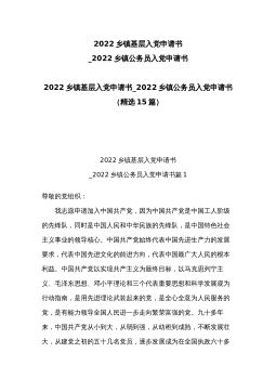 2022乡镇基层入党申请书_2022乡镇公务员入党申请书2022乡镇基层入党申请书_2022乡镇公务员入党申请书(精选15篇)2022乡镇基层入党申请书_2022乡镇公务员入党申请书篇1尊敬的党组织: 我志愿申请加入中国共产党,因为中国共产党是中国工人阶级的先锋队,同时是中国人民和中华民族的先锋队,是中国特色社会主义事业的领导核心。中国共产党始终代表中国先进生产力的发展要求,代表中国先进文化的前进方向,代表中国最广大人民的根本利益。中国共产党以实现共产主义为最终目标,以马克思列宁主义、毛泽东思想、邓小平理论和三个代表重要思想和科学发展观为行动指南,是用先进理论武装起来的党,是全心全意为人民服...