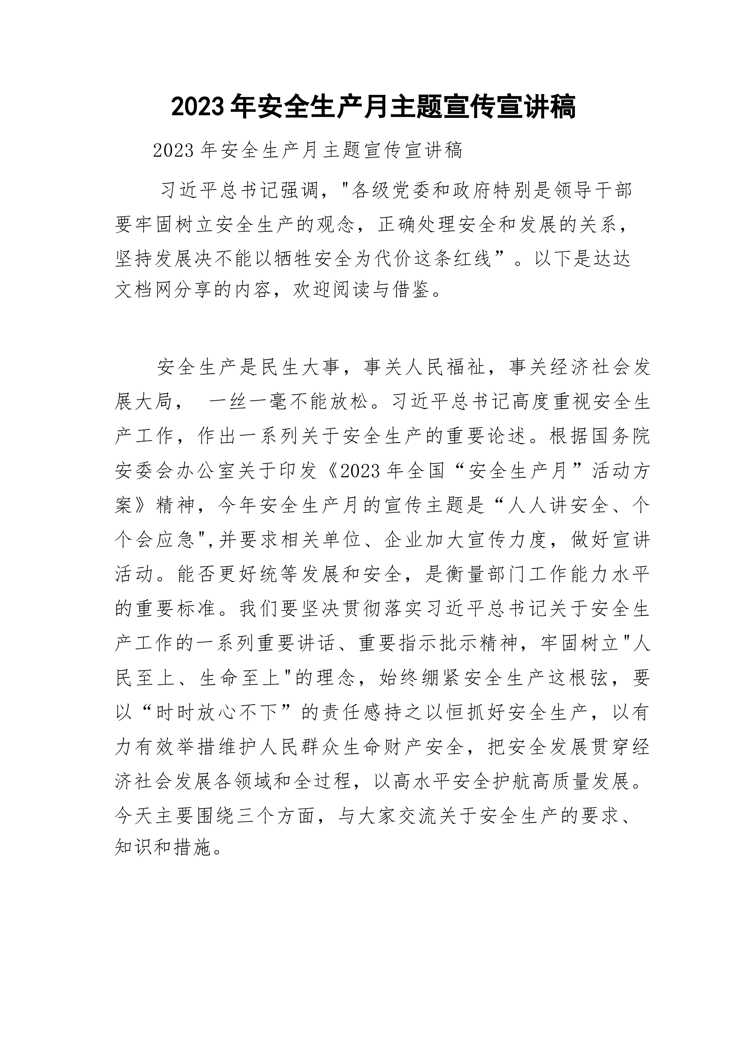 2023年安全生产月主题宣传宣讲稿2023年安全生产月主题宣传宣讲稿习近平总书记强调,"各级党委和政府特别是领导干部要牢固树立安全生产的观念,正确处理安全和发展的关系,坚持发展决不能以牺牲安全为代价这条红线”。以下是达达文档网分享的内容,欢迎阅读与借鉴。安全生产是民生大事,事关人民福祉,事关经济社会发展大局,一丝一毫不能放松。习近平总书记高度重视安全生产工作,作出一系列关于安全生产的重要论述。根据国务院安委会办公室关于印发《2023年全国“安全生产月”活动方案》精神,今年安全生产月的宣传主题是“人人讲安全、个个会应急",并要求相关单位、企业加大宣传力度,做好宣讲活动。能否更好统等发展和安全,是...