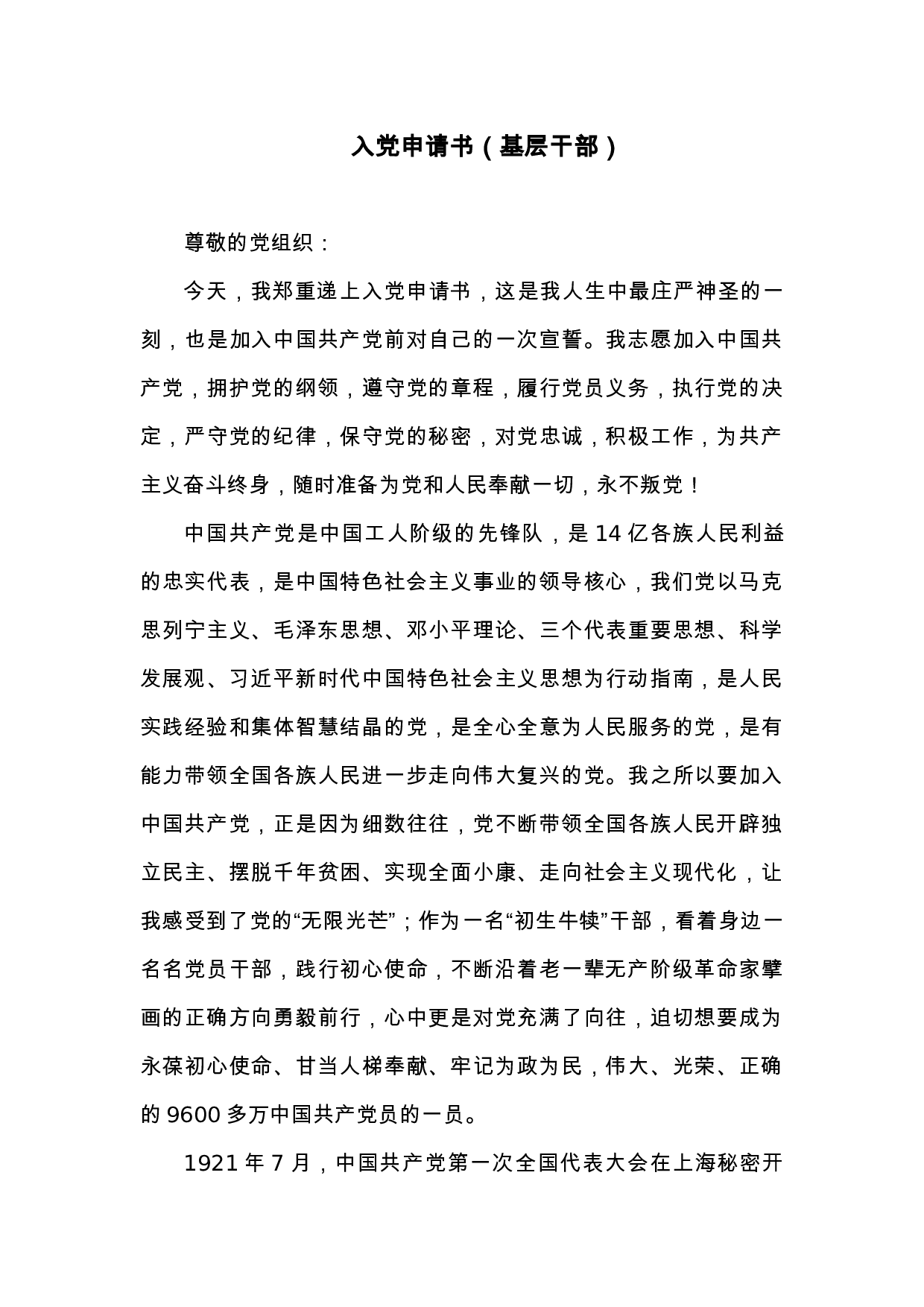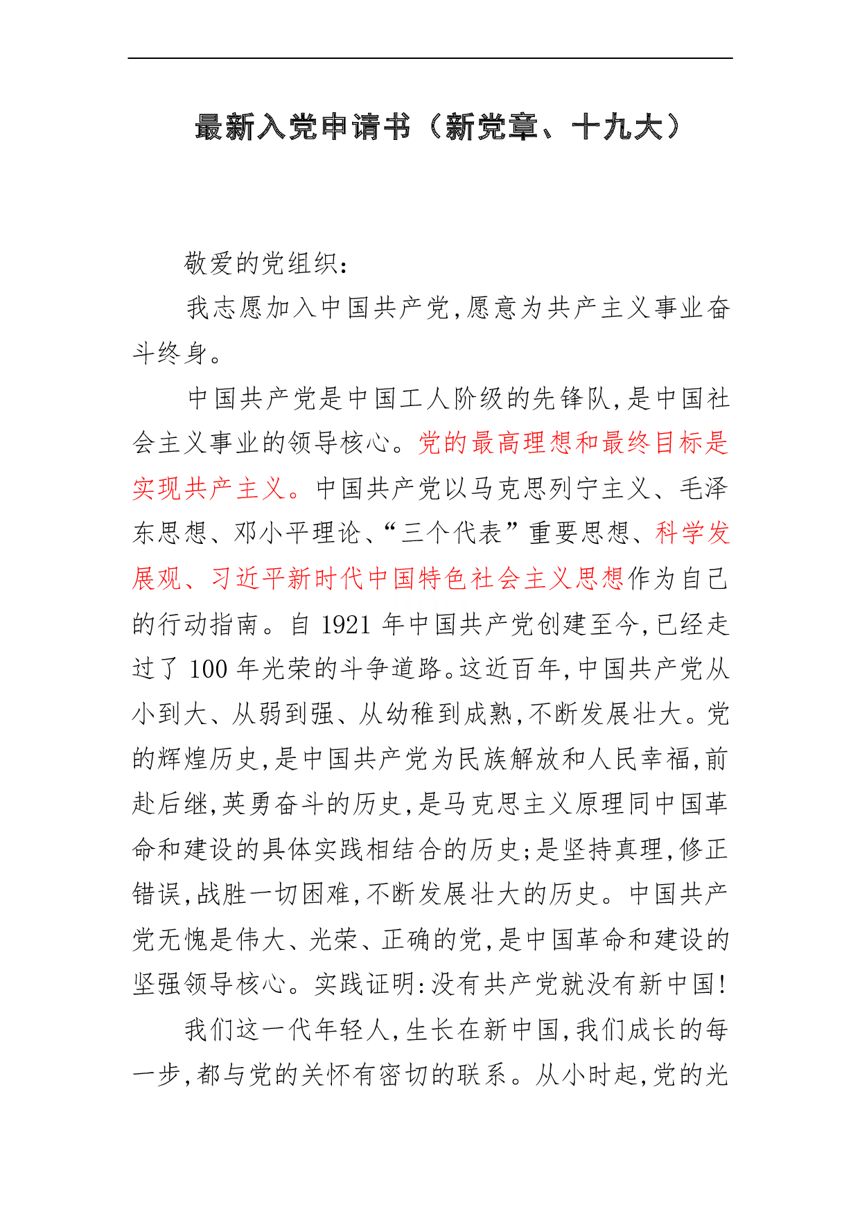 最新入党申请书(新党章、十九大)敬爱的党组织:我志愿加入中国共产党,愿意为共产主义事业奋斗终身。中国共产党是中国工人阶级的先锋队,是中国社会主义事业的领导核心。党的最高理想和最终目标是实现共产主义。中国共产党以马克思列宁主义、毛泽东思想、邓小平理论、“三个代表”重要思想、科学发展观、习近平新时代中国特色社会主义思想作为自己的行动指南。自1921年中国共产党创建至今,已经走过了100年光荣的斗争道路。这近百年,中国共产党从小到大、从弱到强、从幼稚到成熟,不断发展壮大。党的辉煌历史,是中国共产党为民族解放和人民幸福,前赴后继,英勇奋斗的历史,是马克思主义原理同中国革命和建设的具体实践相结合的历史;...