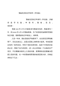 预备党员转正申请书(学生版)预备党员转正申请书(学生版),关键词是学生版,申请书,预备,党员,党支部:我是xxx年×月×日被批准为预备党员的,预备期为一年,到xxxx年×月×日预备期满。为了使党组织如期研究我的转正问题,现将我的转正申请送上,请审查。入党一年来,我在党组织严格要求下,在支部党员帮助教育下,无论从政治上,还是从思想上都有很大提高。特别是通过党内一系列活动,学到了党的光荣传统,加深了对党的宗旨的认识,增强了自己的党性,进一步认识到做一个合格的共产党员,不仅要解决组织上入党的问题,更重要的还是要解决思想入党的问题。在一年的预备期里我的收获是很大的,归纳起来有以下几点:第一,明确了共产...