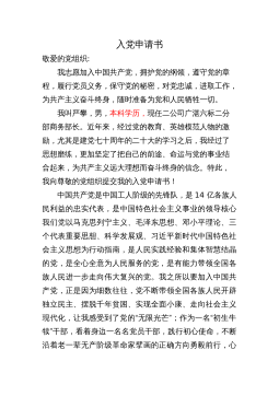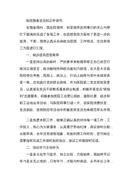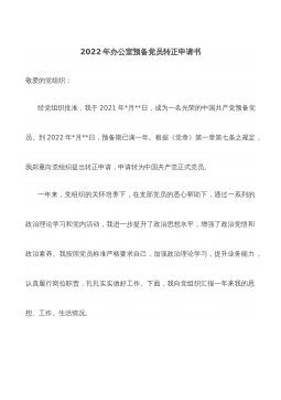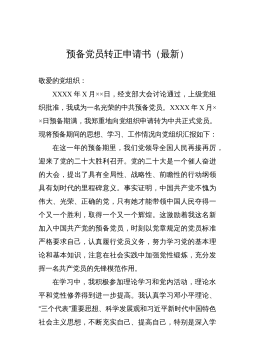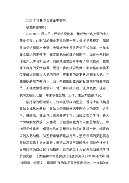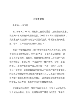 转正申请书敬爱的xx党支部:2022年x月xx日,经支部大会讨论通过,上级党组织批准,我成为一名光荣的中共预备党员。2023年x月xx日预备期满,我郑重地向党组织申请转为中共正式党员。现将预备期间的思想、学习、工作情况向党组织汇报如下:在这一年的预备期里,我们党领导全国人民再接再厉,迎来了党的xx大胜利召开。党的xx大是一个催人奋进的大会,提出了具有全局性、战略性、前瞻性的行动纲领,具有划时代的里程碑意义。事实证明,中国共产党不愧为伟大、光荣、正确的党,只有她才能带领中国人民夺得一个又一个胜利,取得一个又一个辉煌。这激励着我这名新加入中国共产党的预备党员,时刻以D章规定的党员标准严格要求自己,...