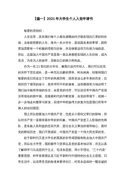 【篇一】2021年大学生个人入党申请书 敬爱的党组织: 人生在世,其实我们每个人都在感慨如何才能实现自己更好的价值,去收获想要的人生。身为一名大学生,是祖国未来的希望,因而更加需要有一个积极的理想与目标,并且朝着这些方向努力地前进。所以,志愿加入中国共产党是我一直以来都想实现的人生目标,成为党员,为党为人民效劳,贡献自己的精力和热血。 作为一名21世纪的大学生,像我们这代年轻人,我们可以在党的关怀下茁壮成长,是一种无比自豪的荣幸。时光匆匆,转眼间我们敬爱的党已经走过了百年的风雨历程,回首党这么多年来的历史,过程经历了艰苦的奋斗,坚持书写不朽的画卷,这些都很有力地证明了我们如今能有幸福的生...