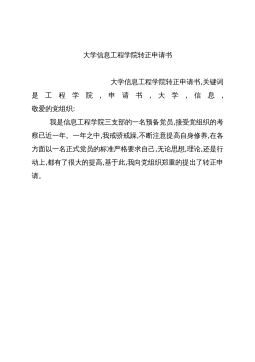 大学信息工程学院转正申请书大学信息工程学院转正申请书,关键词是工程学院,申请书,大学,信息,敬爱的党组织:我是信息工程学院三支部的一名预备党员,接受党组织的考察已近一年。一年之中,我戒骄戒躁,不断注意提高自身修养,在各方面以一名正式党员的标准严格要求自己,无论思想,理论,还是行动上,都有了很大的提高,基于此,我向党组织郑重的提出了转正申请。在市场经济高度发展的今天,一些党员不顾党的法律,置党的优良传统于不顾,敢于以身试法,大大损害了党在人们心中的形象。所以,加强党风建设,严格维护和执行党的纪律是极其必要的。党风是一个政党党性和世界观的外在表现。一个政党具有什么样的党性和世界观,就有什么样的党风...