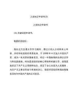 入党转正申请书(3)入党转正申请书(3),关键词是申请书,敬爱的党组织:我在北方交通大学学习期间,通过介绍人介绍和本人申请,并经学校党组织考查批准,于1999年4月加入中国共产党,成为一名光荣的预备党员。经过一年预备期的自身认识学习和实践锻炼,特别是党组织的耐心帮助和积极引导,使我更加坚定了共产主义理想和信念,坚定了全心全意为人民服务,为共产主义事业而奋斗终身的决心。我请求党组织将我由预备党员转为中国共产党的正式党员。江泽民总书记最近在广东考察时指出,要把中国的事情办好,关键取决于我们党。只要我们党始终成为中国先进社会生产力的发展要求、中国先进文化的前进方向、中国最广大人民的根本利益的忠实代表...