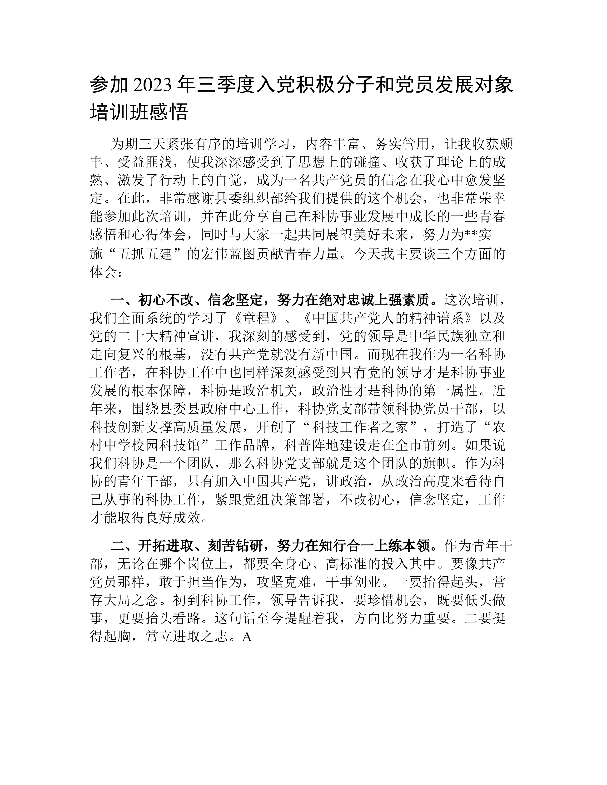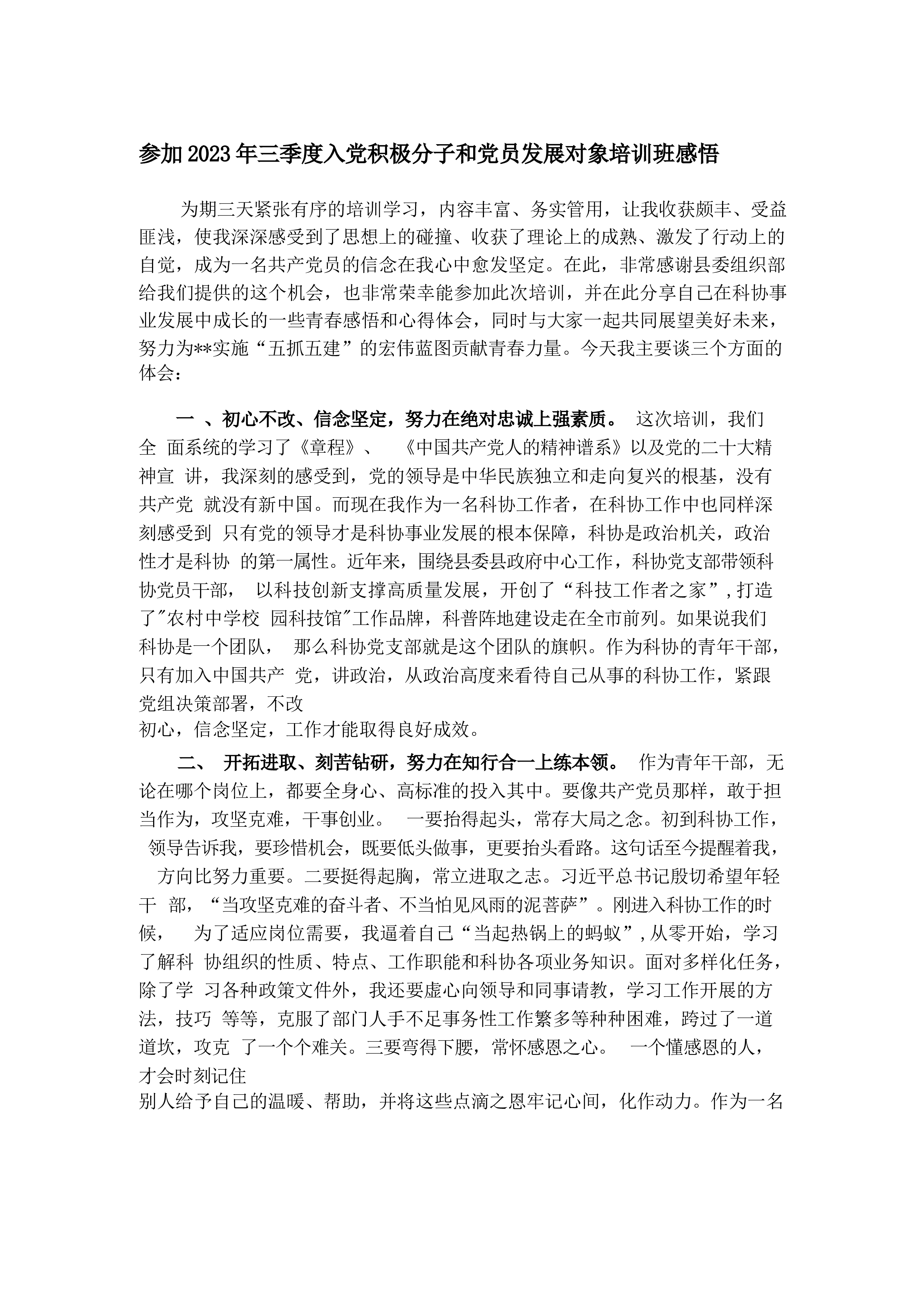 参加2023年三季度入党积极分子和党员发展对象培训班感悟为期三天紧张有序的培训学习,内容丰富、务实管用,让我收获颇丰、受益匪浅,使我深深感受到了思想上的碰撞、收获了理论上的成熟、激发了行动上的自觉,成为一名共产党员的信念在我心中愈发坚定。在此,非常感谢县委组织部给我们提供的这个机会,也非常荣幸能参加此次培训,并在此分享自己在科协事业发展中成长的一些青春感悟和心得体会,同时与大家一起共同展望美好未来,努力为**实施“五抓五建”的宏伟蓝图贡献青春力量。今天我主要谈三个方面的体会:一、初心不改、信念坚定,努力在绝对忠诚上强素质。这次培训,我们全面系统的学习了《章程》、《中国共产党人的精神谱系》以及党...