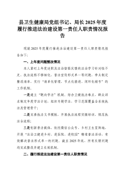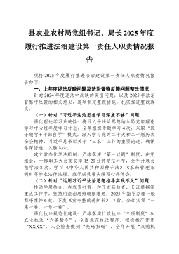 县农业农村局党组书记、局长2025年度履行推进法治建设第一责任人职责情况报告现将2025年度履行推进法治建设第一责任人职责情况报告如下:一、上年度述法反映问题及法治督察反馈问题整改情况针对2024年度述法中反映的突出问题,以及2025年法治督察中反馈的相关意见,逐项制定整改措施,扎实推进整改落实。(一)针对“习近平法治思想学习深度不够”问题强化理论学习系统性:将习近平法治思想纳入局党组理论学习中心组年度学习计划,全年组织专题学习4次,采取“班子领学+干部自学”模式,深入学习党的二十大和二十届历次全会精神、习近平总书记关于“三农”工作的重要论述,确保学深悟透、入脑入心。建立常态化学法机制:严格落实“第一议题”制度,在党组会、干部职工大会前安排15-20分钟学法环节,全年开展会前学法8次,学习《...