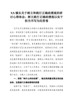 XX镇长关于树立和践行正确政绩观的研讨心得体会:树立践行正确政绩观以实干担当书写为民答卷近平总书记围绕树立和践行正确政绩观发表的一系列重要论述,深刻回答了政绩为谁而树、树什么样的政绩、靠什么树政绩等根本性问题,为广大党员干部干事创业指明了前进方向、提供了根本遵循。作为XX镇党委副书记、镇长,身处县城“首位镇”的关键岗位,肩负着推动XX打造高质量发展建设共同富裕示范区26县标杆的重要使命,我深刻认识到,正确政绩观是基层治理和发展的“定盘星”,更是党员干部履职尽责的“指南针”。基层工作直面群众、直面发展一线,政绩的成色最终要靠发展实效来检验、靠群众口碑来评判。唯有始终把造福人民作为政绩观的核心要义,以发展为实践基点、以人民为价值支点、以实干为工作落点,才能将正确政绩观融入镇域发展各方面全过程,扛...