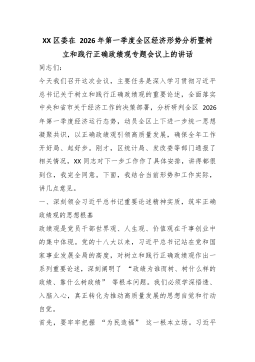 XX区委在2026年第一季度全区经济形势分析暨树立和践行正确政绩观专题会议上的讲话同志们:今天我们召开这次会议,主要任务是深入学习贯彻习近平总书记关于树立和践行正确政绩观的重要论述,全面落实中央和省市关于经济工作的决策部署,分析研判全区2026年第一季度经济运行态势,动员全区上下进一步统一思想凝聚共识,以正确政绩观引领高质量发展,确保全年工作开好局、起好步。刚才,区统计局、发改委等部门通报了相关情况,XX同志对下一步工作作了具体安排,讲得都很到位,我完全同意。下面,我结合当前形势和工作实际,讲几点意见。一、深刻领会习近平总书记重要论述精神实质,筑牢正确政绩观的思想根基政绩观是党员干部世界观、人生观、价值观在干事创业中的集中体现。党的十八大以来,习近平总书记站在党和国家事业发展全局的高度,对树...