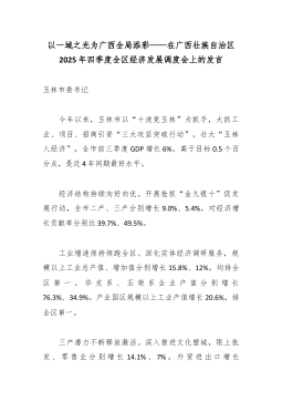 以一域之光为广西全局添彩——在广西壮族自治区2025年四季度全区经济发展调度会上的发言玉林市委书记 今年以来,玉林市以“十虎竞玉林”为抓手,大抓工业、项目、招商引资“三大攻坚突破行动”,壮大“玉林人经济”,全市前三季度GDP增长6%,高于目标0.5个百分点,是近4年同期最好水平。 经济结构持续向好向优。开展抢抓“金九银十”促发展行动,全市二产、三产分别增长9.0%、5.4%,对经济增长贡献率分别达39.7%、49.5%。 工业增速保持领跑全区。深化实体经济调研服务,规模以上工业总产值、增加值分别增长15.8%、12%,均排全区第一。华友系、玉柴系企业产值分别增长76.3%、34.9%。产业园区规模以上工业产值增长20.6%,排全区第一。 三产潜力不断释放激活。深入推进文化塑城,限上批...