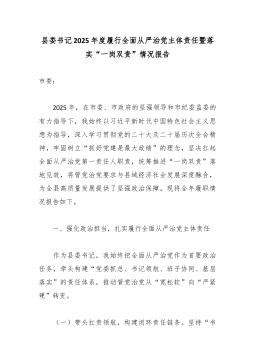 县委书记2025年度履行全面从严治党主体责任暨落实“一岗双责”情况报告市委: 2025年,在市委、市政府的坚强领导和市纪委监委的有力指导下,我始终以习近平新时代中国特色社会主义思想为指导,深入学习贯彻党的二十大及二十届历次全会精神,牢固树立“抓好党建是最大政绩”的理念,坚决扛起全面从严治党第一责任人职责,统筹推进“一岗双责”落地见效,将管党治党要求与县域经济社会发展深度融合,为全县高质量发展提供了坚强政治保障。现将全年履职情况报告如下。 一、强化政治担当,扎实履行全面从严治党主体责任 作为县委书记,我始终把全面从严治党作为首要政治任务,牵头构建“党委抓总、书记领航、班子协同、基层落实”的责任体系,推动管党治党从“宽松软”向“严紧硬”转变。 (一)带头扛责领航,构建闭环责任链条。坚持“...