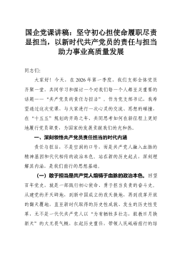 国企党课讲稿:坚守初心担使命履职尽责显担当,以新时代共产党员的责任与担当助力事业高质量发展同志们:大家好!今天,在2026年第一季度,我们支部全体党员齐聚一堂,共同学习和探讨一个对我们每一个人都至关重要的话题——“共产党员的责任与担当”。作为党支部书记,我希望通过这次党课,与大家进行一次心灵的交流、思想的碰撞,在“十五五”规划的开局之年,共同思考如何在新征程上更好地履行党员职责,为国家的发展贡献我们的光和热。一、深刻领悟共产党员责任担当的时代内涵责任与担当,不是空洞的口号,而是共产党人融入血脉的精神基因和代代相传的政治本色。站在新的历史起点,深刻理解其内涵,是我们前行的思想基础。(一)敢于担当是共产党人熔铸于血脉的政治本色。回望百年党史,就是一部践行初心使命、勇于担当负责的奋斗史。从建党的开...