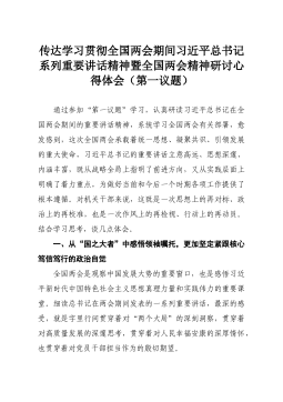 传达学习贯彻习近平总书记在看望参加政协会议的农工党九三学社医药卫生界社会福利和社会保障界委员时的重要讲话精神心得体会(第一议题)通过参加本次第一议题集中学习,深入研读习近平总书记在看望参加政协会议的农工党、九三学社、医药卫生界、社会福利和社会保障界委员时的重要讲话,我深受教育、深受启发。总书记的重要讲话,立足“两个大局”,统筹发展与健康、当前与长远、事业与民生,既指明了健康中国建设的前进方向,也为我们在本职岗位上更好履职尽责提供了根本遵循。结合学习体会和工作实际,谈几点认识。一、在学深悟透中把准方向,在对标对表中坚定立场总书记的重要讲话,贯穿着鲜明的政治立场和深厚的人民情怀,集中体现了以人民为中心的发展思想。特别是对“把保障人民健康放在优先发展的战略位置”的强调,不仅是对卫生健康领域的部署要...