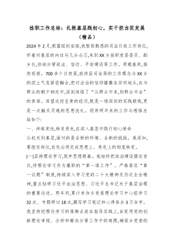 挂职工作总结:扎根基层践初心,实干担当促发展(精品)2024年2月,根据组织安排,我暂别熟悉的司法行政工作岗位,怀着对基层的向往与几分忐忑,来到XX乡挂职党委委员、副乡长,协助分管政法、信访、平安建设等工作。两载春秋,倏然而逝。700多个日夜里,我将县司法局的工作理念与XX乡的泥土气息紧密融合,把对法治的信仰播撒在田间地头,在与群众的朝夕相处中,深刻体悟了“从群众中来,到群众中去”的真谛。回望这段宝贵的经历,既是一场深刻的实践锻炼,更是一次触及灵魂的思想洗礼。现将两年来的工作与感悟总结如下:一、淬炼党性,转变角色,在深入基层中践行初心使命从机关到基层,面对的是全新的环境、全新的挑战。我深知,要胜任岗位,首先必须完成思想上、角色上的彻底转变。(一)坚持理论学习,筑牢思想根基。我始终把政治建设摆...