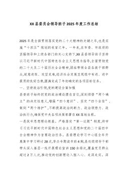 XX县委员会领导班子2025年度工作总结2025年是全面贯彻落实党的二十大精神的关键之年,也是实施“十四五”规划的收官之年。一年来,在市委、市政府的坚强领导和上级各部门的关心支持下,XX县委领导班子坚持以习近平新时代中国特色社会主义思想为指导,全面贯彻党的二十大及二十届历次全会精神,团结带领全县各族干部群众,锐意进取、攻坚克难,经济社会发展呈现稳中有进、进中提质的良好态势,圆满完成了年初确定的各项目标任务。一、坚持政治引领,党的建设全面加强县委班子始终把党的政治建设摆在首位,深刻领悟“两个确立”的决定性意义,增强“四个意识”、坚定“四个自信”、做到“两个维护”,不断提高政治判断力、政治领悟力、政治执行力,确保党中央各项决策部署在XX落地生根。一是筑牢思想理论根基。严格落实“第一议题”制度,将...